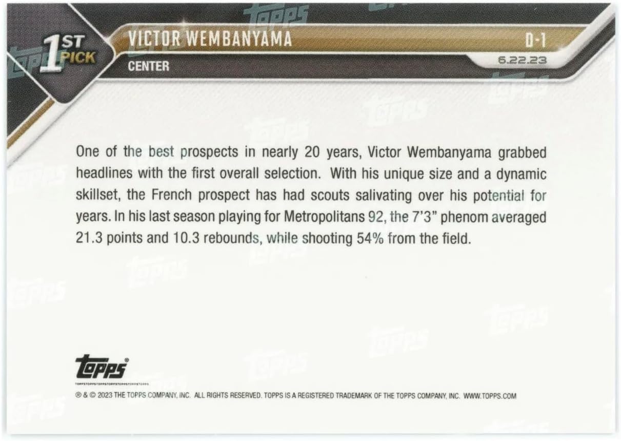 This is for a 2-Card Lot- 2023 Topps Now Victor Wembanyama #D1 and #472- RC Rookie Selected with 1st Overall Pick- Draft Night-6/22/23 and Star throws out 1st Pitch in the Bronx- 6/20/23- Basketball Trading Card- San Antonio and New York Yankees. 2 Total Cards, Both are Shipped in New Protective Screwdown Holder.
