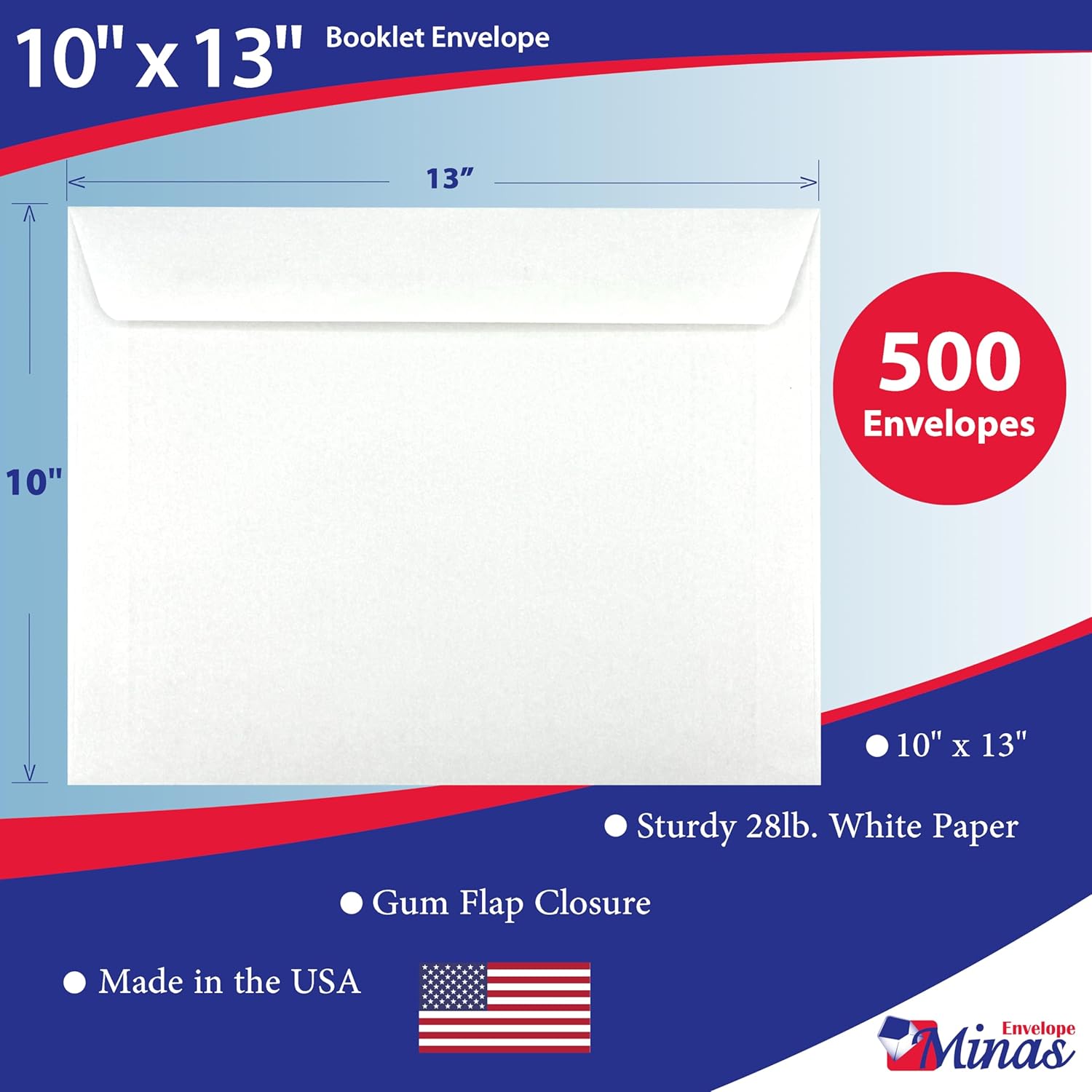 Elevate your mailing and organizational capabilities with these premium 10" x 13" booklet envelopes from Minas Envelope. Each box contains 500 high-quality envelopes crafted from robust 28lb white wove paper, offering professional-grade durability for your important documents. The convenient side-opening design makes it effortless to insert and remove catalogs, reports, and full-size materials, while the deep gum flap ensures your contents remain securely sealed. These versatile envelopes are perfect for office correspondence, school materials, and systematic filing needs. Made in the USA, these envelopes combine reliable construction with practical functionality. Their generous dimensions accommodate a wide range of documents, making them an essential addition to any office or institutional setting. The clean white finish maintains a professional appearance for all your mailing and storage requirements.