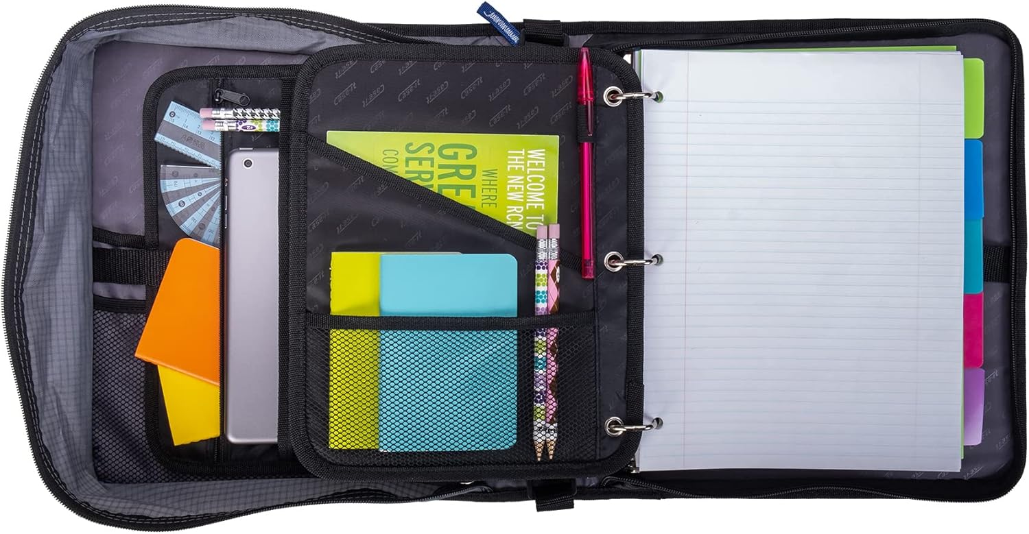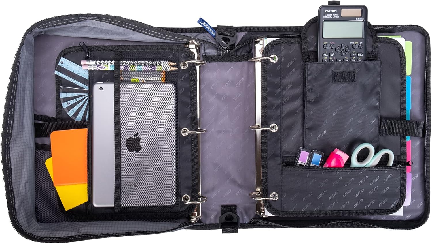 The Case-it Universal is a 2-In 1 Zipper Binder - two 1.5 inch D-rings comes with Shoulder Strap. This option includes an exterior tech pouch that fits up to 600 sheets. The cushioned laptop pocket helps protect your valuable equipment from getting damaged so that you can continue working at your best. Stay organized with the Universal Zipper Binder! The 1.5-inch ring has a capacity of up to 600 sheet pages, plus an inside pocket can store writing utensils, calculators, and more. We build our binders using only the highest quality materials to strengthen and maximize durability for a consumer on the go. A convenient carrying handle and shoulder strap makes this binder ideal for travel!
