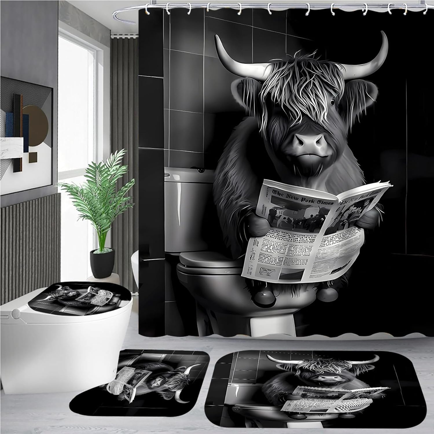 Cow Print Shower Curtain:The 4-piece shower curtain set combines style, functionality and durability. available in a variety of colors and patterns, it's ideal for those who want to give their bathroom a new, stylish look. whether you prefer a classic, minimalist look or a bold, modern design, there's a set to suit your taste.