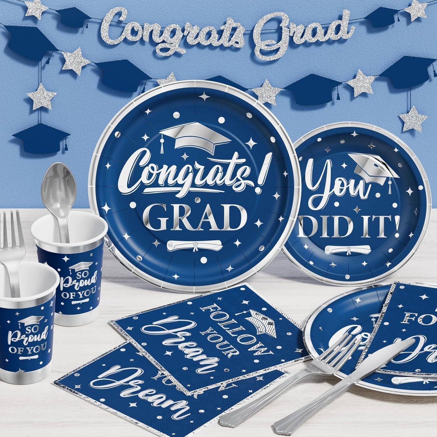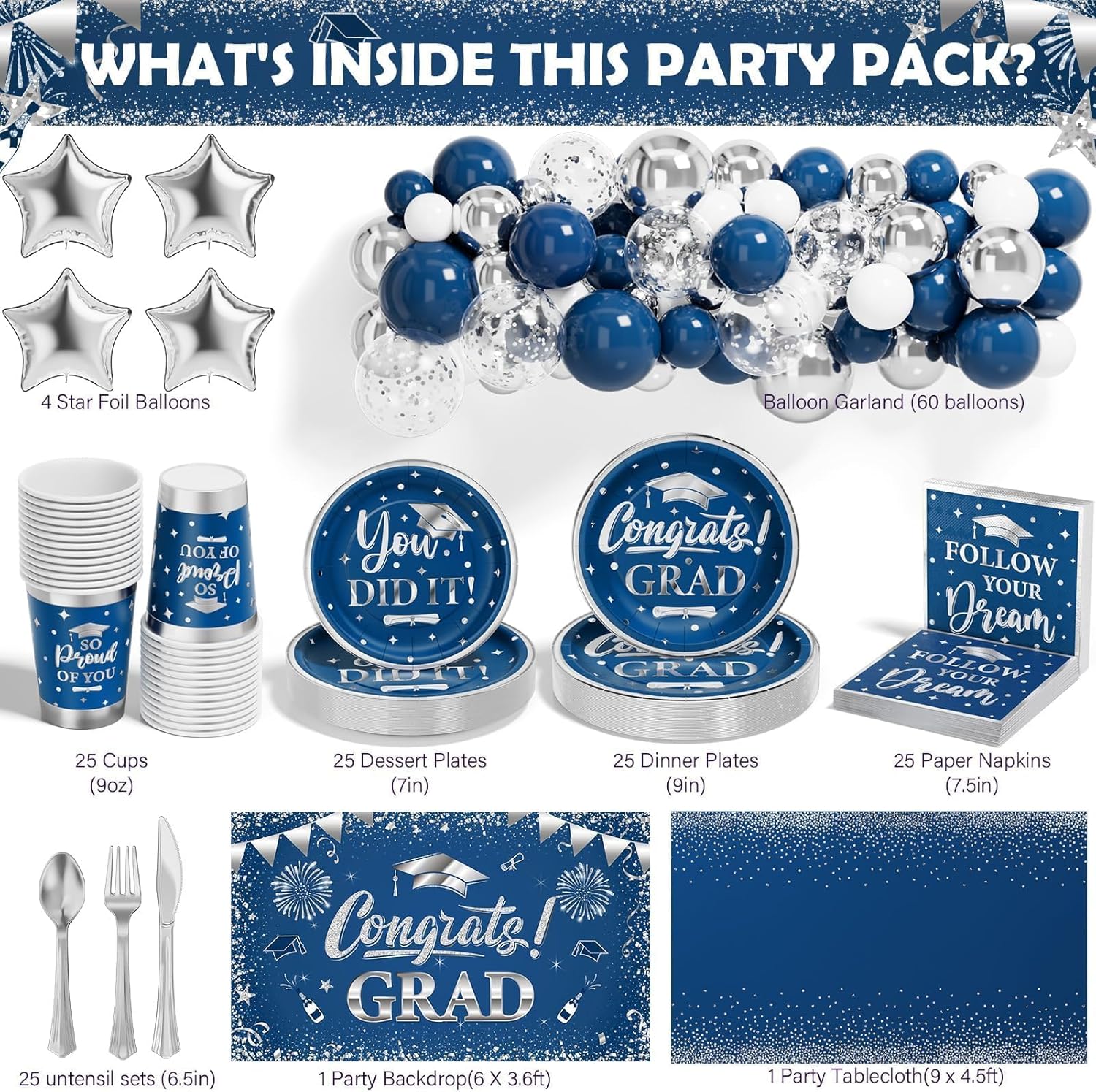 Are you plan to throw a grad party that will to be the best one around & WOW your guests?Looking for grad party decor set that you can decorate quickly, easily & no need to worry about cleaning after the party?Ecomore all-in-one grad-themed class of 2026 party decoration set covered from party decor to tableware is exactly what you need & it definitely won’t let you down.Equipped with installation tools, you can easily to set up the graduation party!All grad-themed dinnerware & decor kit are made from disposable paper, plastic or cloth that can help you clean up easier.Just throw them away when you clean after the graduation party.WHY CHOOSE Ecomore PARTY DECORATIONS SUPPLIES?PREMIUM QUALITY & HUMANIZED DESIGNS- All blue silver graduation party plates, cups & napkins of disposable dinnerware set are made from recycled 100% food grade & BPA-Free heavy duty paper that are non-toxic.- Easy to clean, just throw them away when you clean after the graduation party.- Comes with installation tools, you can easily to set up the party decoration in a short time.- ALL-IN-ONE BOX blue silver graduation party decorations set come with everything you need like balloons, tablecloth, backdrop & disposable dinnerware.These blue and silver graduation party decoration ideas will be fun to put together & will make your party amazing!PERFECT GRADUATION PARTY DECORATIONS- Perfect for kindergarten preschool graduation, middle school graduation, high school graduation, college graduation, graduate school graduation or any graduation themed even.PACKEGE INCLUDEDS:25 X FORKS, 25 X KNIVES, 25 X SPOONS, 25 X NAPKINS25 X 9 INCH DINNER PLATES, 25 X 7 INCH DESSERT PLATES25 X 9OZ DISPOSABLE PAPER CUPS, 1 X PARTY BACKDROP(6 X 3.6FT)1 X PARTY TABLECLOTH(9 X 4.5FT), 1 X PARTY DECOR BALLOONS SET(64PCS), 4 X INSTALLATION TOOLS