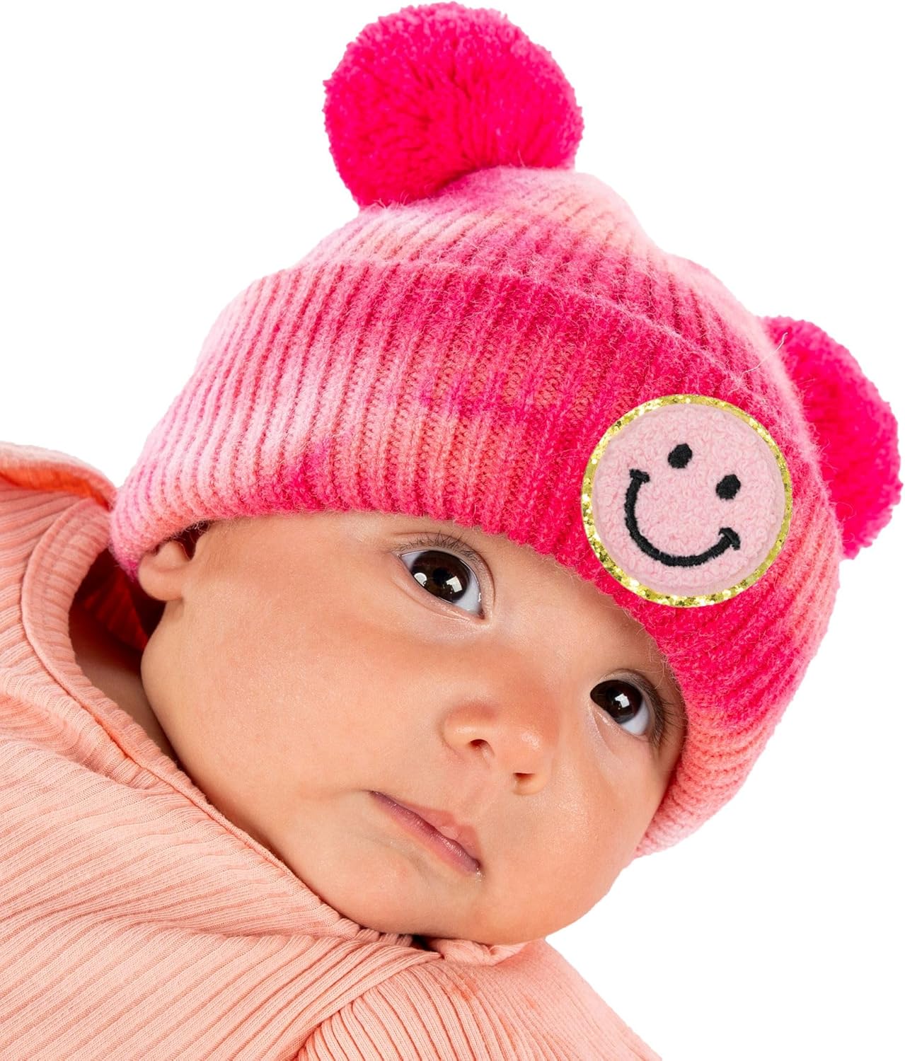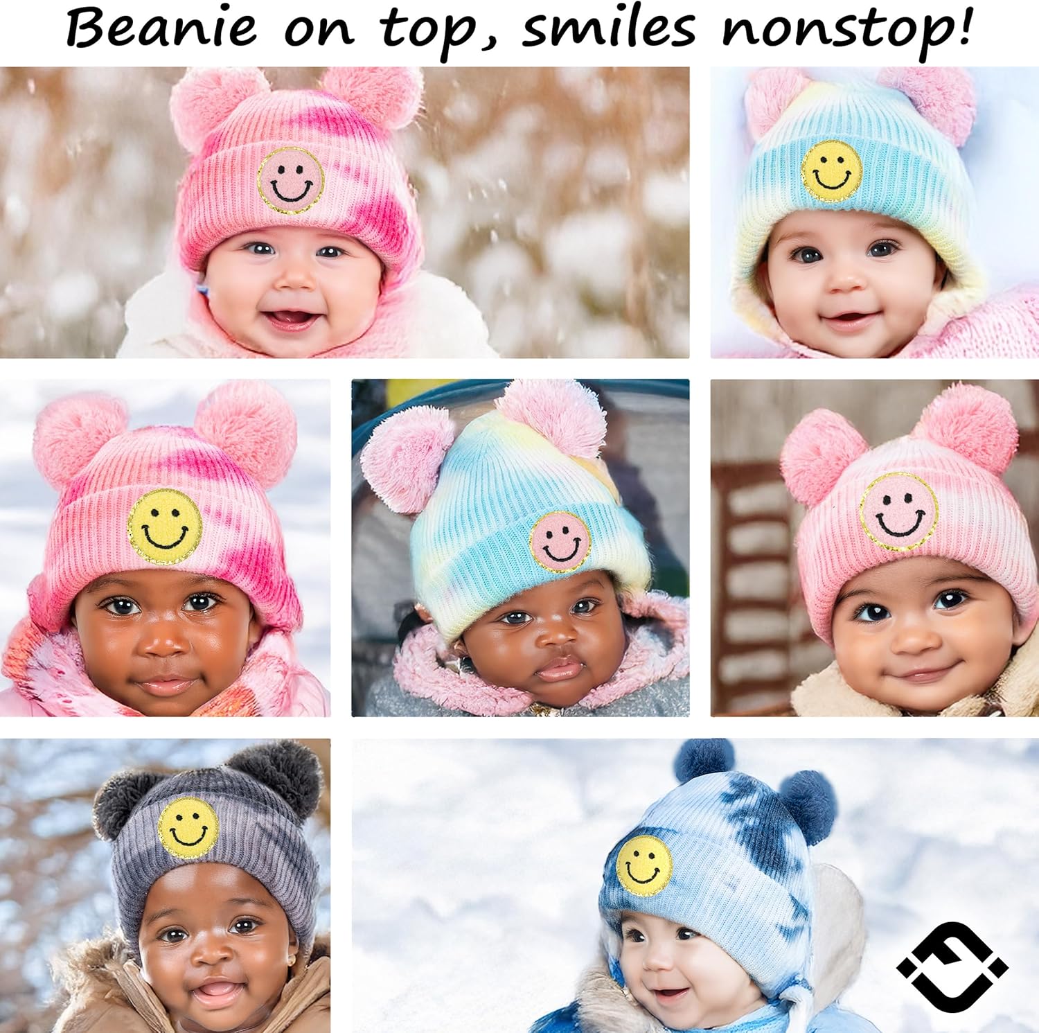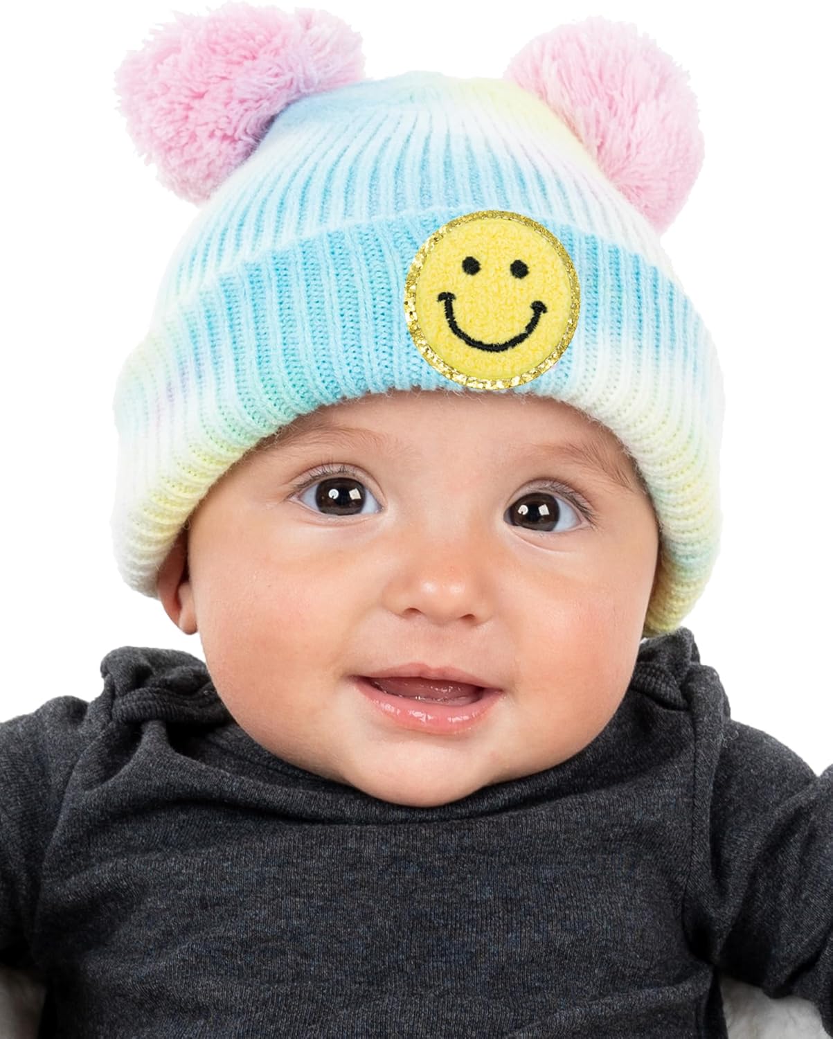 • GREAT LOOK: These double pom baby beanies are perfect for adding a pop of color and style to your baby’s wardrobe. The tie-dye design and fluffy pom-poms create a cheerful and trendy look, while the chenille smiley face patch brings a playful and charming vibe. Available in a variety of fun colors, these baby boy winter hats and baby girl hats are ideal for winter adventures, from everyday wear to family outings.