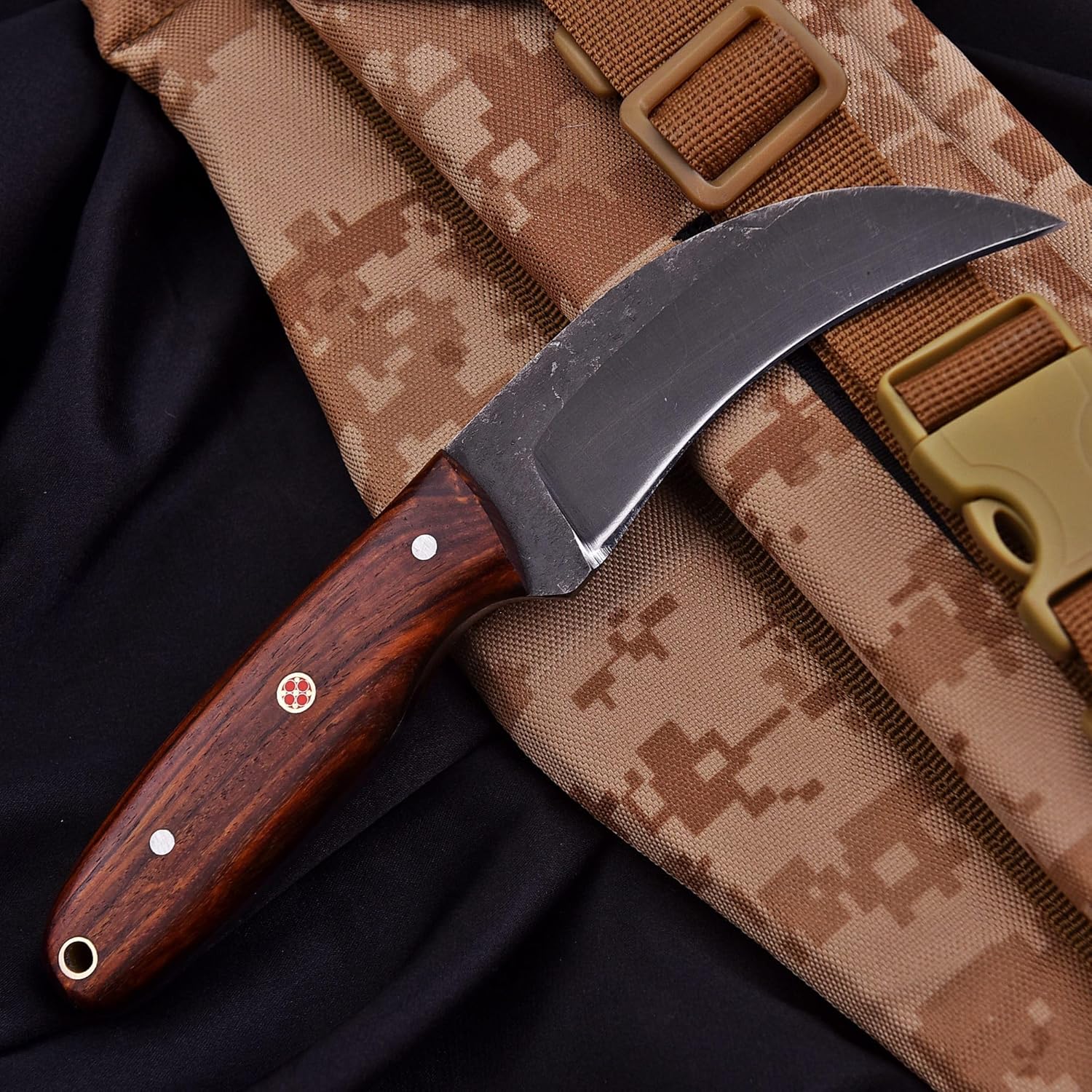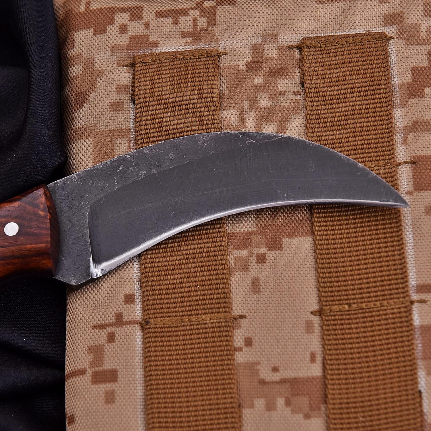 Custom Handmade High Carbon Steel Fixed Blade Lineman Hawkbill knife with Rose Wood Handle EDC Full-tang Tactical outdoor survival Bushcraft knive Wire skinning knives Overall Length: 8" inches Blade Length: 4" inches Handle Length: 4" inches Blade Material. 1095 High Carbon Steel Handle Material. Rose Wood Upgrade your electrical tool kit with Durable Leather Sheath this Handmade Hand Forged 1095 Steel Lineman Hawkbill Knives, a professional-grade cutting and stripping tool crafted for precision and durability. Built from 1095 high carbon steel, the blade offers exceptional edge retention and toughness, making it perfect for everyday job-site tasks such as wire skinning, cable stripping, and utility cutting. The signature hawkbill blade shape delivers controlled cutting power, gripping insulation and cables naturally to ensure clean, accurate strips without slipping. Its fixed blade, full-tang construction provides the strength needed for heavy-duty use, while the ergonomically designed handle guarantees a stable, comfortable grip—even during extended electrical or mechanical work. Each knife includes a premium leather sheath, allowing safe storage and fast access while on the job. Rugged, reliable, and purpose-built, this hawkbill knife is ideal for electricians, linemen, HVAC technicians, telecom professionals, and anyone who needs a dependable utility blade that performs consistently.