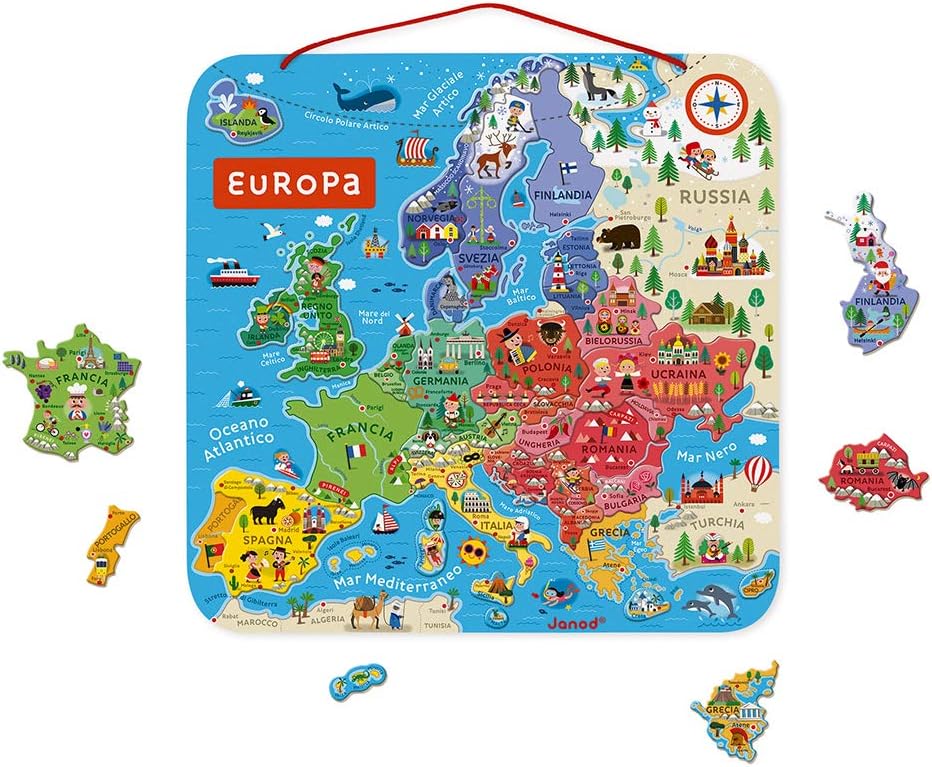 Children from 7 to 12 years discover Europe with 40 magnets and create their own map of Europe. With this educational puzzle from Janod children can learn the geography of Europe in a playful way. Children will have great fun putting each country in its right place to get a complete map of Europe to hang on the wall. Thanks to the colourful wooden puzzle pieces that depict countries with their capital, relief, fauna and flora, children get to know this small piece of our planet in a playful way. The map of Europe is made of wood (MDF and plywood) and glued paper print. A cotton string for hanging the card is also included. French version. Includes 1 magnetic card, 40 magnets. Material(s) used: wood (MDF for the top + plywood for the magnets), cotton (string). Recommended age group: from 7 to 12 years.