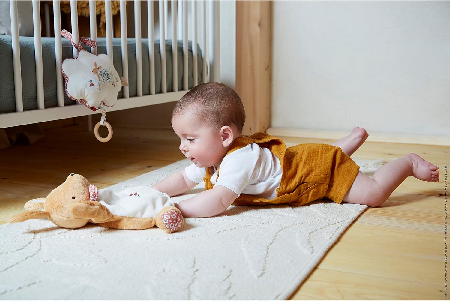 My little rabbit ran into the garden! Put on this hand puppet and animate it by singing or broadcasting the nursery rhyme from which it is inspired. Thanks to the delicately embroidered patterns on the belly of this rabbit cuddly toy, tell your little one beautiful poetic adventures or play hide and seek with this cuckoo puppet to make them laugh. Once the story is over, give the rabbit to the baby. This plush rabbit then becomes a sensory awakening toy. Its contrasting colors, gripping ribbons, long ears and soft limbs stimulate eyesight, touch and curiosity. A delicate print decorates its petons and bow. Ideal as a gift for a new baby. Care instructions: wash separately, machine wash at 30°C, without fabric softener, stain remover or other additives. This product belongs to the Kaloo Little Songs collection, which offers matching fabric musical cushions and plush puppets, representing famous nursery rhymes for children, to soothe baby or stimulate their senses. Contains a soft toy puppet made of micro-velvet and super-velvet, recycled polyester filling. Dimensions: 26 x 9 x 24 cm (L x W x H). Suitable from birth.