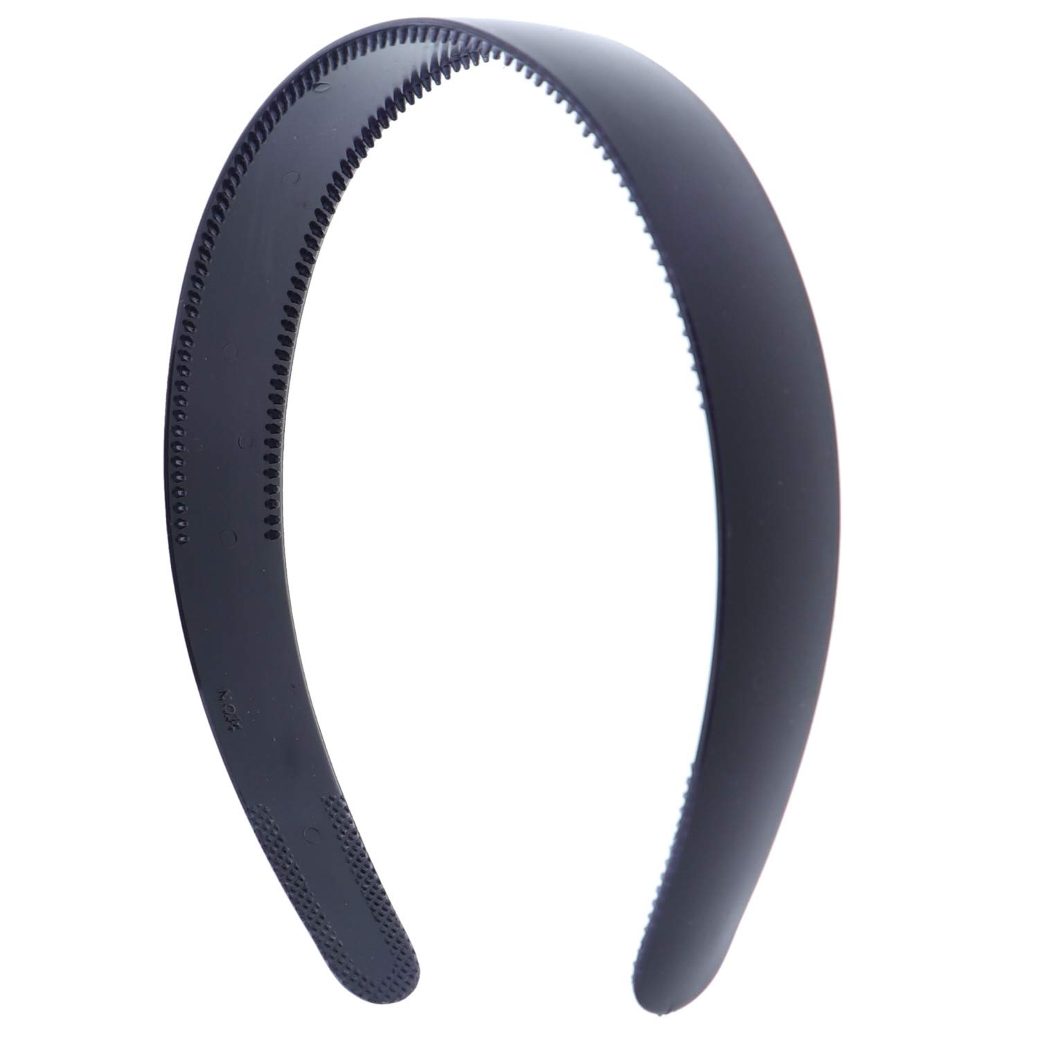 This is a quality headband in a great classic color. There are 2 rows of teeth which keep it in place in your hair. It measures 1 inch wide. Looks great on! Great Quality! Pack of 12 headbands