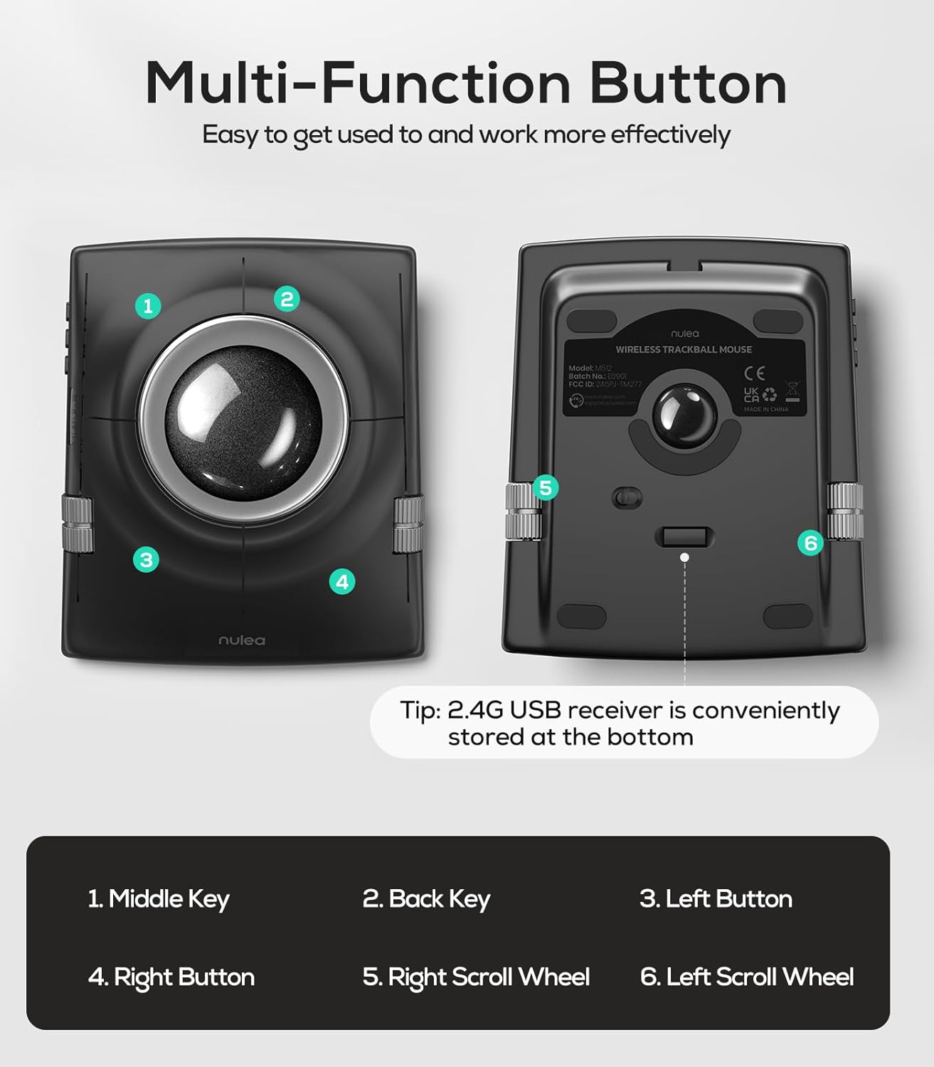 Nulea M512 Wireless Trackball Mouse, Ergonomic 55mm Trackball, Adjustable DPI for Precise Control, Left or Right Hand Compatible, Rechargeable Ergonomic Design for Comfort: The trackball mouse is designed to reduce hand movement, making usage more comfortable and less straining on your arm; ideal for long work hours in both home offices and shared spaces.