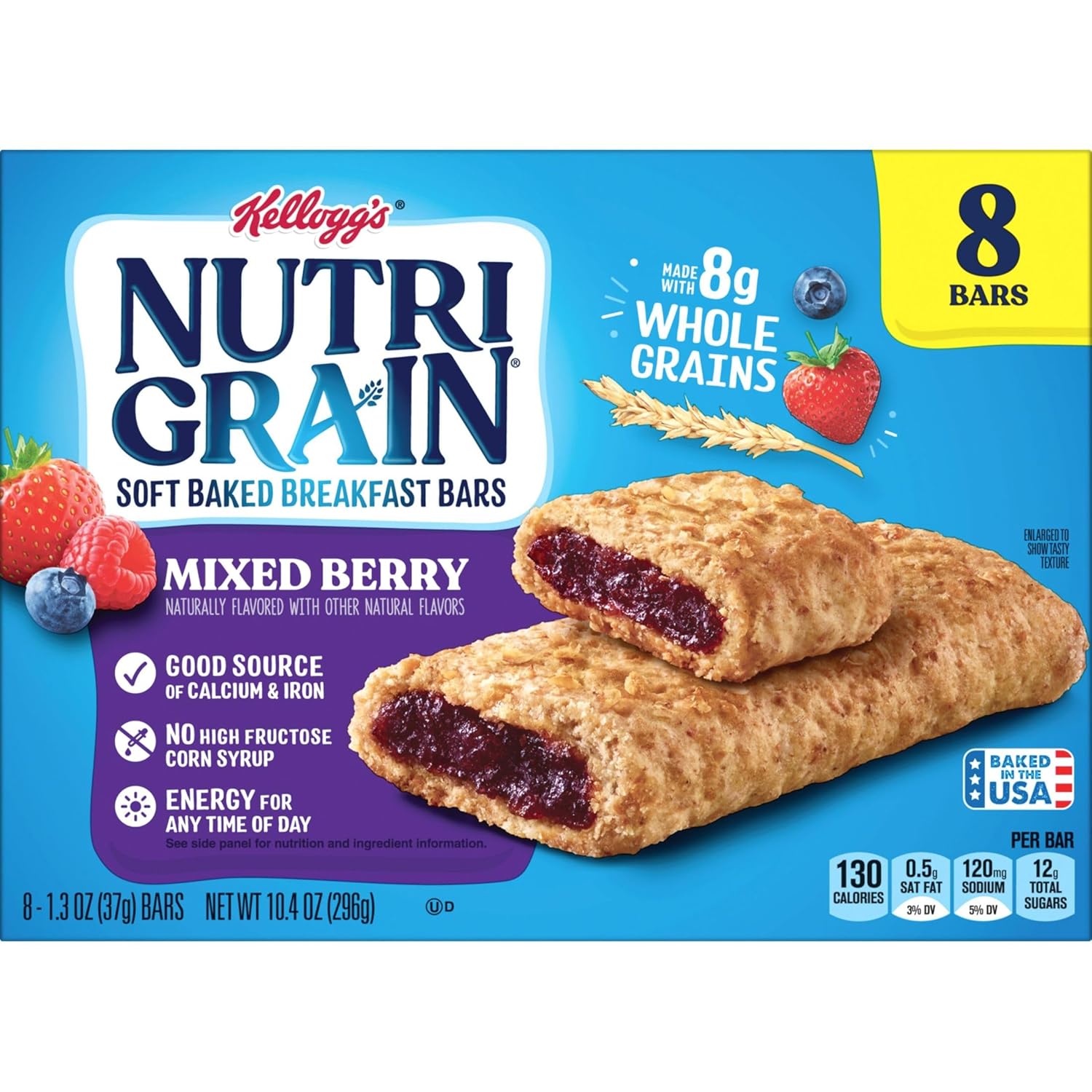 Come prepared for busy mornings with Nutri-Grain. Includes six, 10.4-ounce boxes containing a total of 48 Nutri-Grain Mixed Berry Breakfast Bars. These delicious and convenient mixed berry-flavored bars are a great start to any morning and help empower parents and kids to win the day. With tasty fruit flavor that kids will love, 8g of whole grains, and a good source of 8 vitamins and minerals, these bars are a balanced addition to any breakfast. Grab a pouch for the kids to eat at home in the morning; pack a snack for the bus on the way to school. Nutri-Grain Soft Baked Breakfast Bars not only make a tasty addition to your morning, they're also a great choice when you're packing gift baskets or care packages; the delicious options are endless. With this convenient and perfectly baked bar, savvy parents and kids will feel prepared for whatever the day may bring