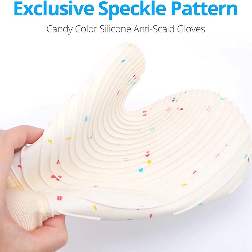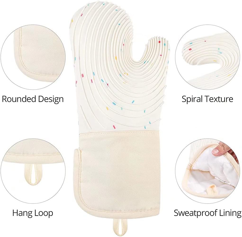 Features: The oven mitts are made from BPA-free food-grade silicone and come in a unique candy-colored design. It's the perfect combination of durability and artistry. The extended length of 13.3 inches (about 34 cm) provides better protection for fingers, hands and wrists from possible burns and also makes this glove very easy to put on and take off. Anti-slip spiral texture provides more stable control. A comfortable soft cotton lining layer provides extra heat protection and non-slip grip while cooking or baking. The silicone part is stain-resistant and easy to clean. Daily laundering or machine cleaning will not tear, thin or wear this glove. Hanging loops allow you to conveniently store gloves. Specification: Product name: Silicone insulated gloves. Material: Food grade silicone + cotton. Temperature resistance: -40°C-230°C. Product size: 34*18*2cm. Weight: 130g for a single glove. Note: All dimensions of the product are measured by hand, but please note that there is a certain error, but it does not affect the use. Due to the difference in shooting light and display, there may be slight color difference, please refer to the actual product. Made of cloth material which does not waterproof. Keep away from open flames and burning materials. Buy with confidence: We offer 24-hour friendly email customer service. If you have any questions, please contact us. We will provide you with the best solution as soon as possible.
