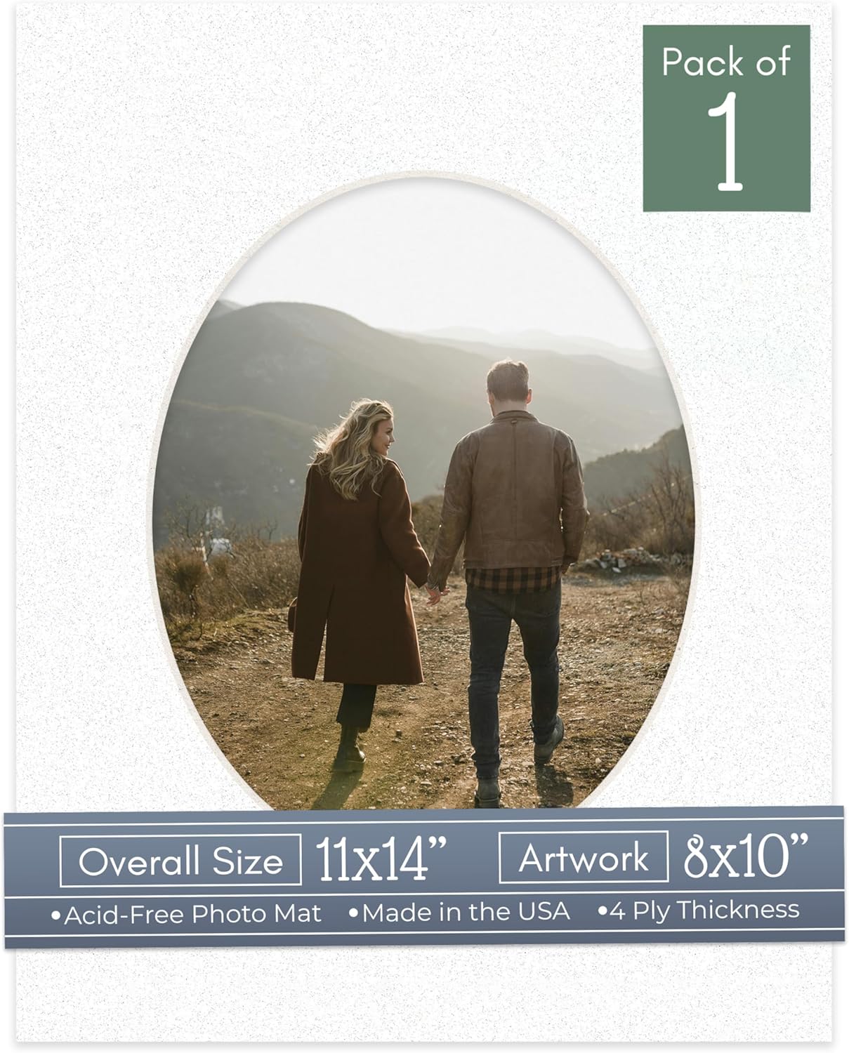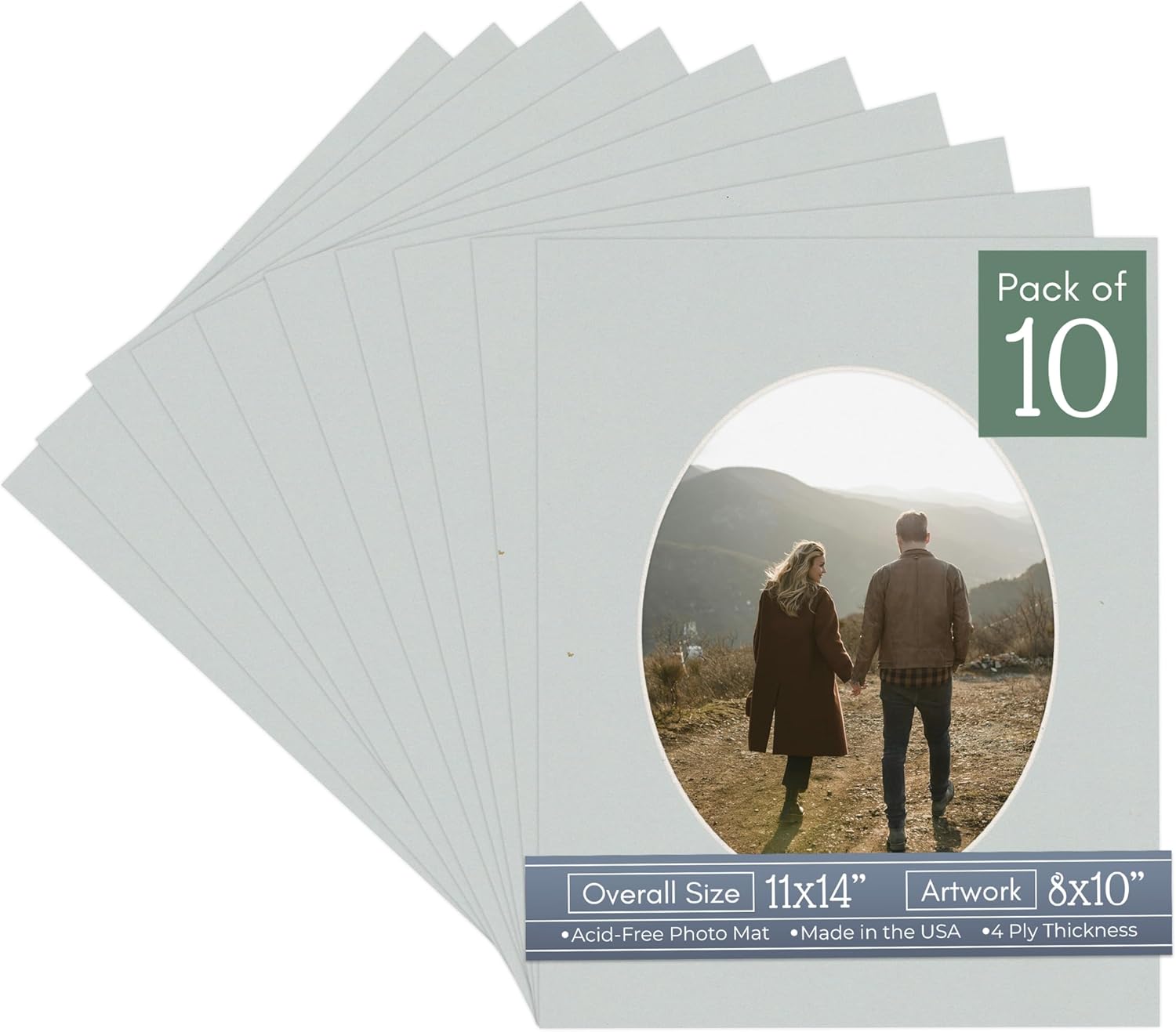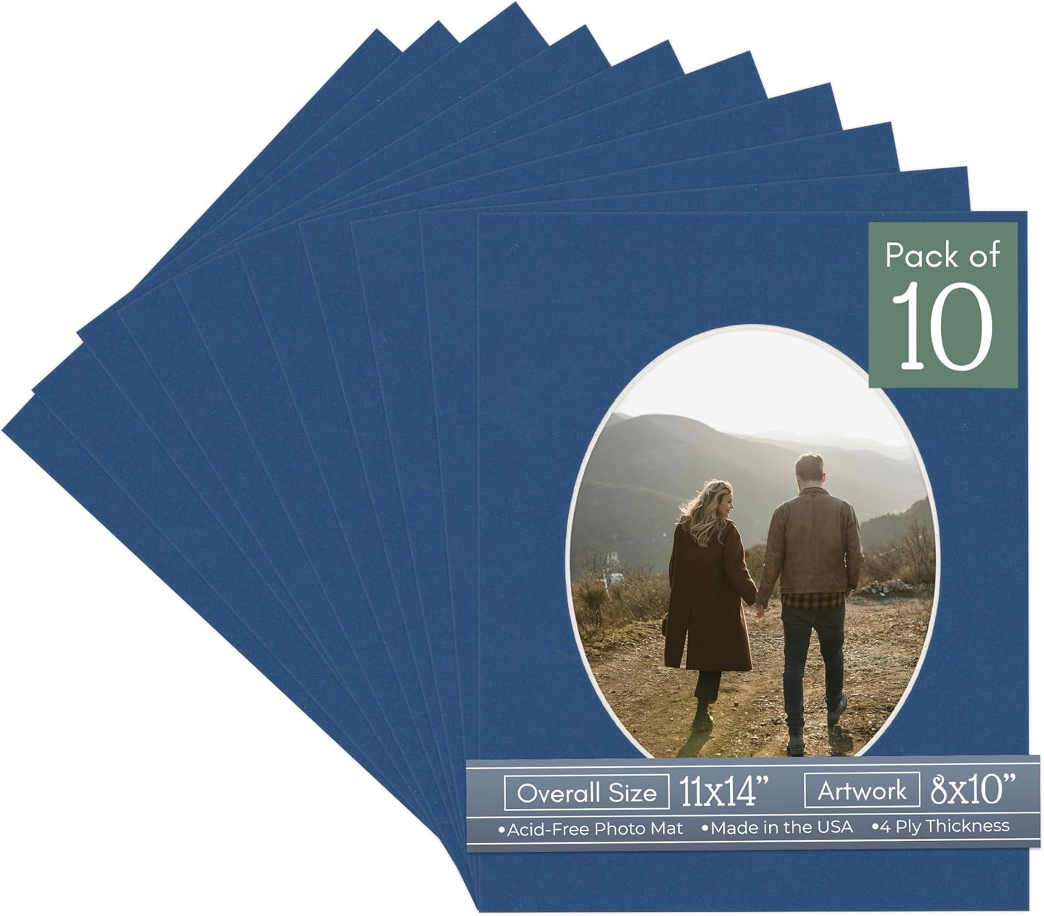 Our acid-free White Linen Canvas matboards are 4-ply and feature a white core. With an overall size of 11x14, these mats with Oval openings fit perfectly into 11x14 frames and are bevel cut to showcase your 8x10 photos. Actual mat opening size is 7.5x9.5 inches so that it may safely and securely house your 8x10 photo, artwork, needlepoint, sign, etc. This pack includes 10 Matboards. Proudly made in the USA by Country Art House!