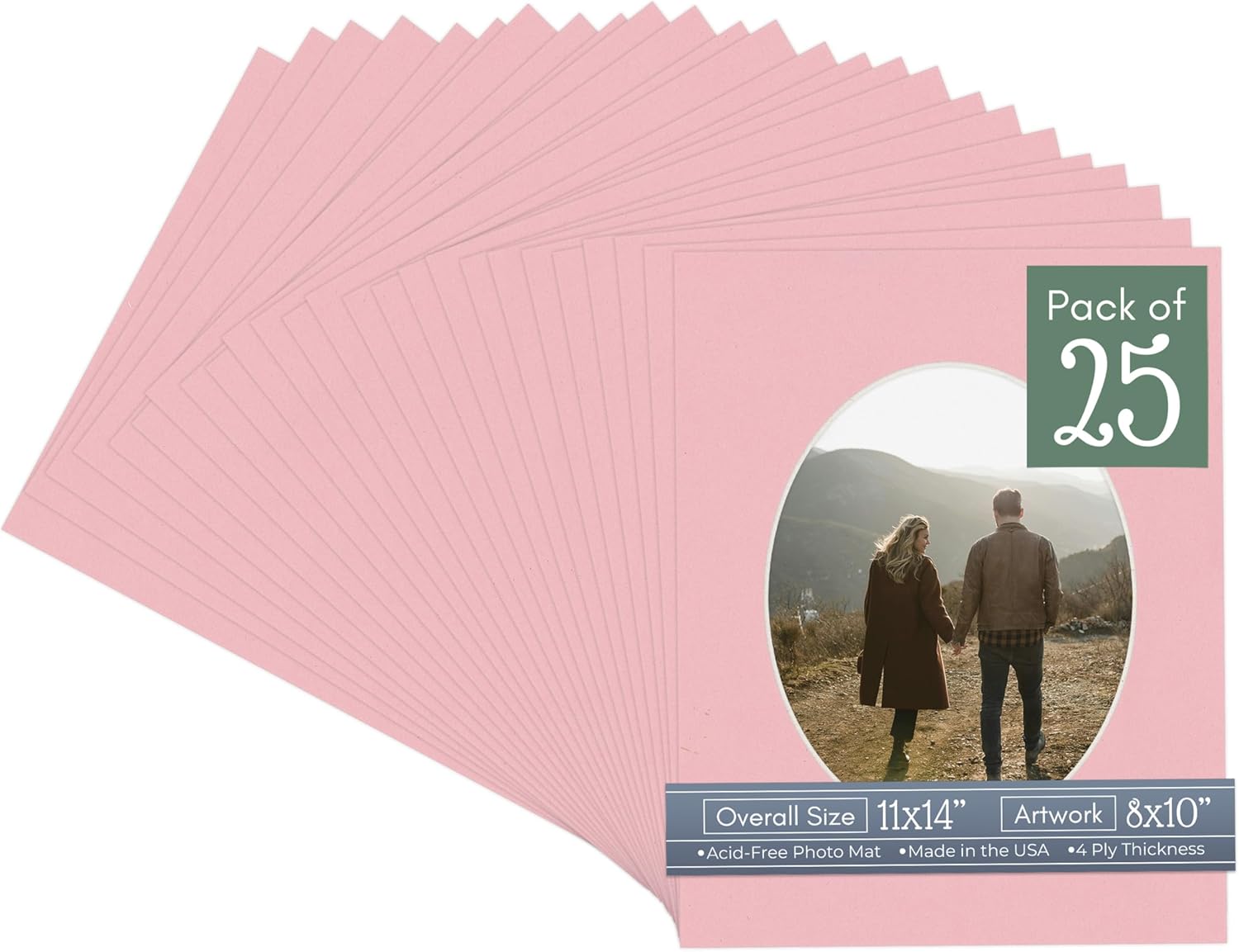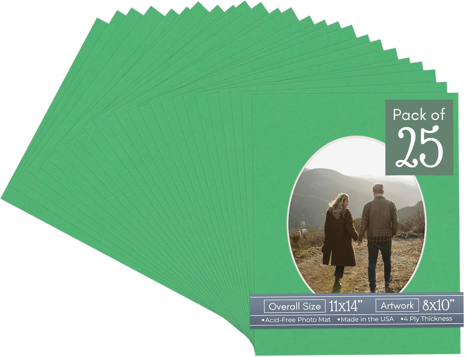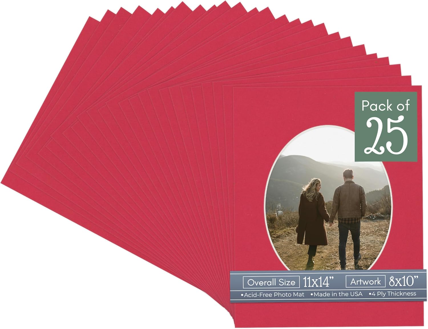 Our acid-free White Linen Canvas matboards are 4-ply and feature a white core. With an overall size of 11x14, these mats with Oval openings fit perfectly into 11x14 frames and are bevel cut to showcase your 8x10 photos. Actual mat opening size is 7.5x9.5 inches so that it may safely and securely house your 8x10 photo, artwork, needlepoint, sign, etc. This pack includes 10 Matboards. Proudly made in the USA by Country Art House!
