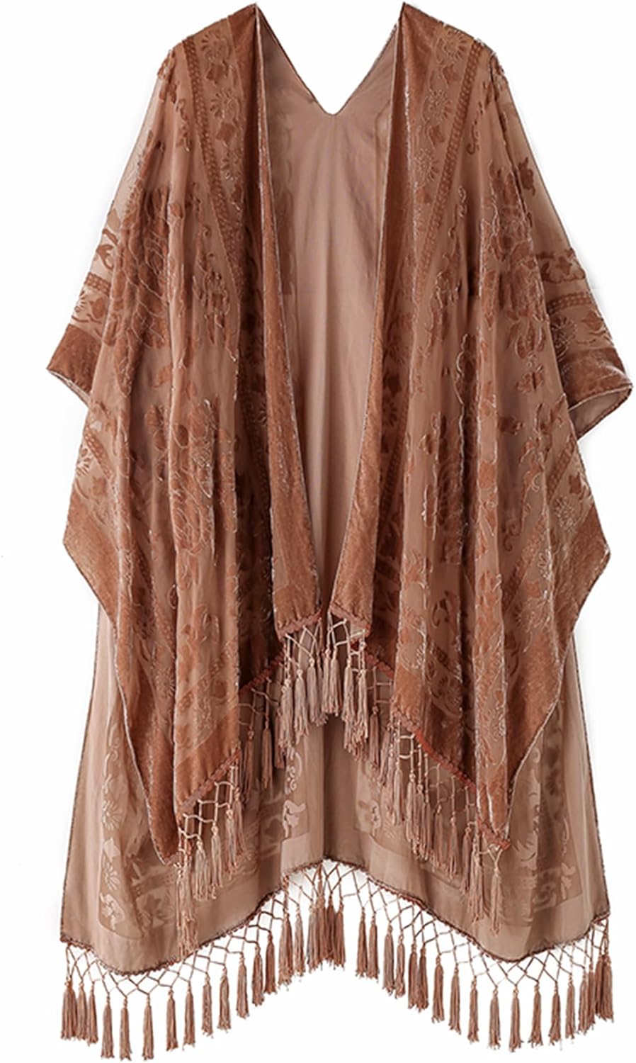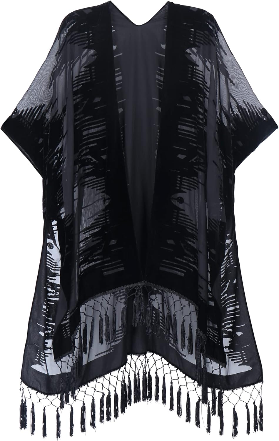 Elevate your style with this exquisite burnout velvet kimono cardigan cover-up. Crafted from a premium blend of rayon and nylon, this kimono offers exceptional softness and flowing movement. The versatile design features 100% handcrafted knotted tassels measuring 6 inches (15cm) at the bottom, adding an elegant touch. With generous dimensions of 43 inches (109cm) in width and 35 inches (89cm) in length, this one-size kimono accommodates body shapes from M to 4XL. Perfect for multiple styling options, wear it open as a flowing cardigan, drape it as a shawl or scarf, or create different looks by tying the front ends together. Whether paired with a slip dress and heels for a glamorous evening, or worn over a bathing suit at the beach, this kimono adds sophistication to any ensemble. The breathable fabric and elegant velvet texture make it an ideal choice for both casual outings and special occasions.