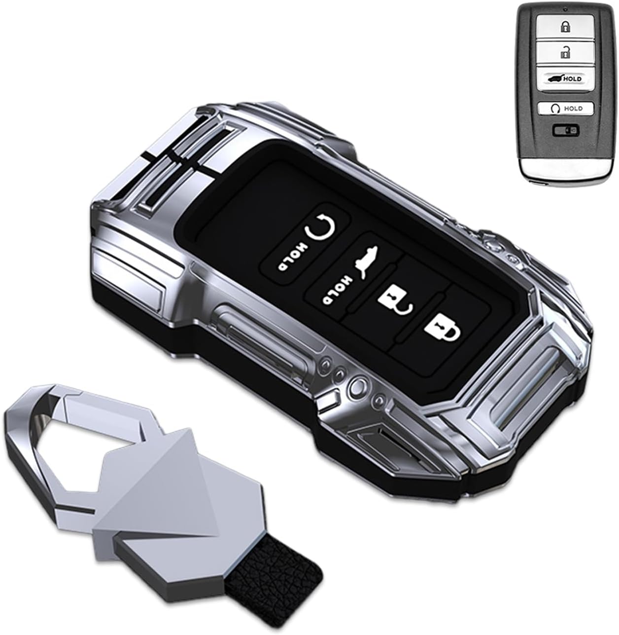 Features: One pcs car remote key cover with keychain 100% brand new and high quality, shown as picture Made with premium quality zinc alloy+silicone material -Protect your car key from scratches -Excellent matching the key size and accurate button position -Protect your auto keys from damage, marks, dust and scratches -Does not affect the signal of the car key Description: 1. A fashion look for your car key 2. It is extremely durable and will protect your car key from everyday wear and tear 3. Very easy to install and use 4. Material: zinc alloy+silicone gel Fitment: Compatible for Acura RDX 4-Button 2016-2021 Compatible for Acura RLX 4-Button 2016-2017 Compatible for Acura ILX 4-Button 2016-2020 Compatible for Acura TLX 4-Button 2015-2021 Compatible for Acura MDX 4-Button 2014-2021 Package Included: 1Pcs key case with keychain (not include the car key)