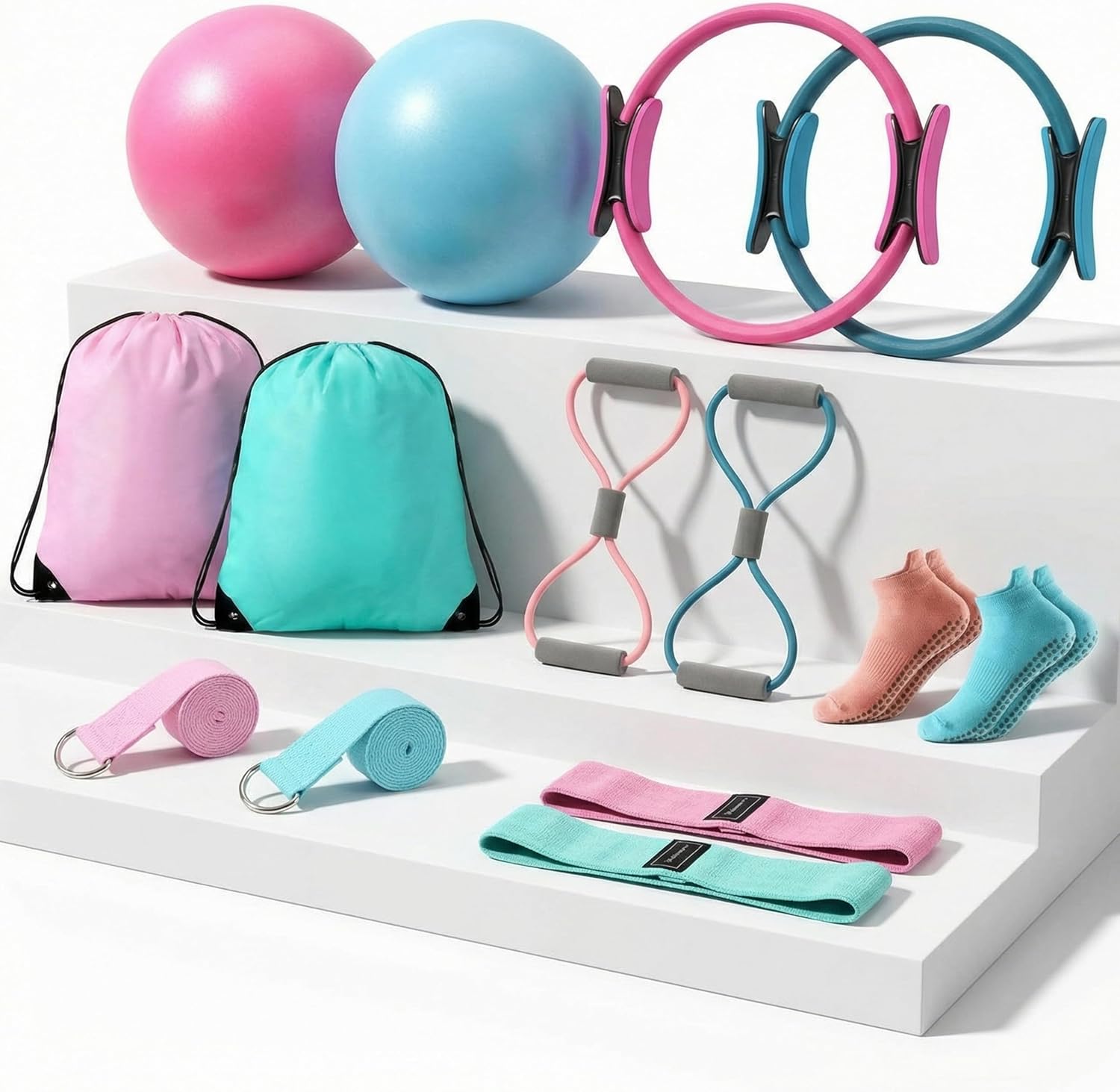 | Included Components | 3 Pairs of non slip socks, 3 x Gym back bags,3 x Resistance bands,3 X 8 Resistance bands, 3 x Pilates ring circles,3 x Stretching straps,3 x Yoga balls |